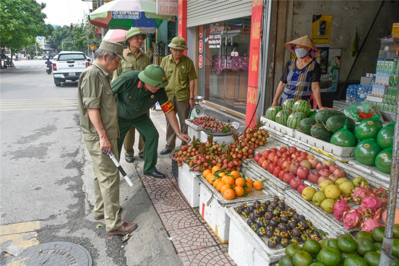 Tổ tự quản ATGT khu phố 6 (phường Thanh Sơn, TP Uông Bí) nhắc nhở hộ kinh thu gọn hàng hóa bày bán trên vỉa hè.