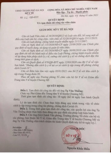 Chiều 5/1/2021, lãnh đạo Sở Sở Y tế Hà Nội vừa ký quyết định tạm đình chỉ công tác trong vòng 10 ngày đối với ông Tạ Văn Thiềng - Phó Giám đốc Trung tâm Y tế huyện Chương Mỹ.