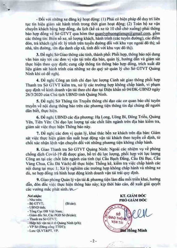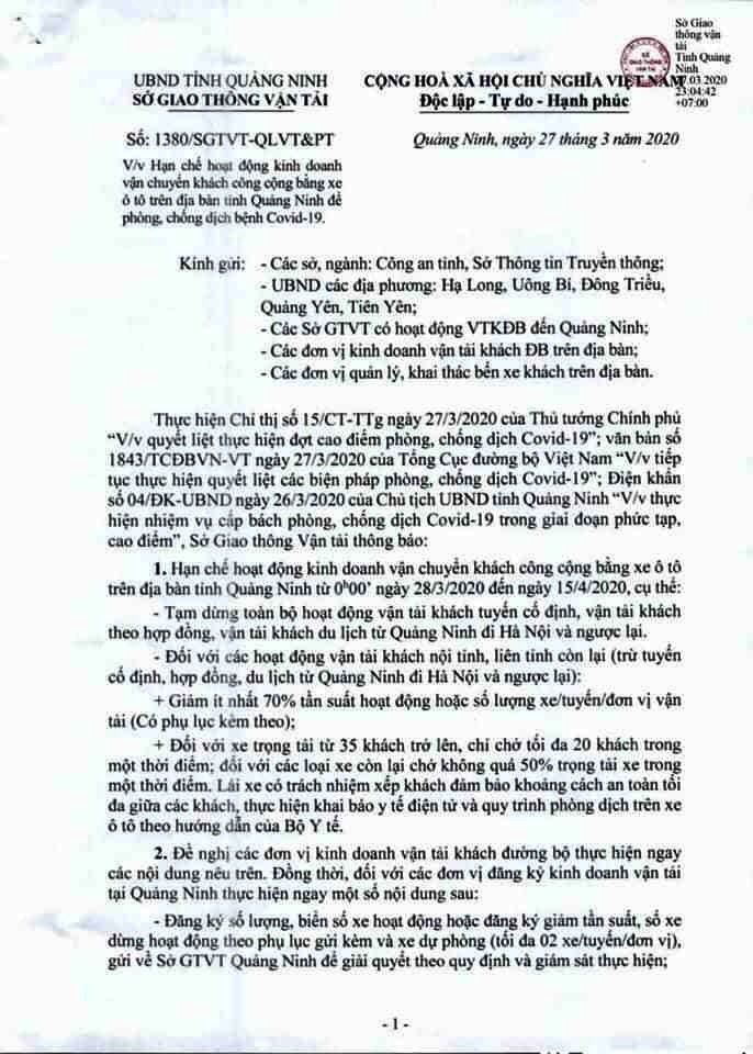 Công văn số 1380/SGTVT-QLVT&PT ngày 27/3/2020 của Sở Giao thông Vận tải tỉnh Quảng Ninh: V/v Hạn chế hoạt động kinh doanh vận chuyển khách công cộng bằng xe ô tô trên địa bàn tỉnh Quảng Ninh để phòng, chống dịch bệnh Covid-19