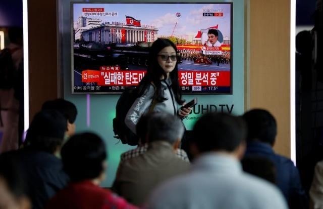 Các hành khách tại một nhà ga ở Hàn quốc theo dõi thông tin về vụ phóng tên lửa thất bại của CHDCND Triều Tiên, ngày 16-4. (Ảnh: Reuterrs)