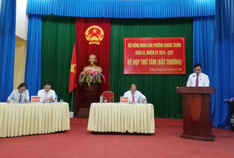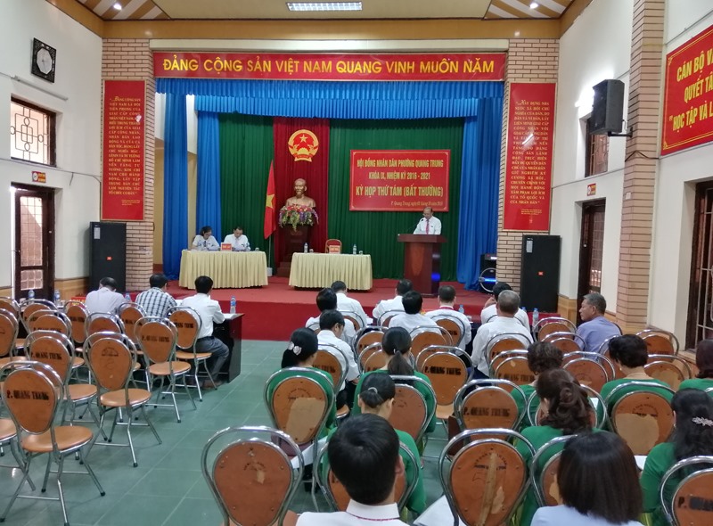 Ngày 1-10, HĐND phường Quang Trung tổ chức kỳ họp thứ VIII (kỳ họp bất thường) nhằm kiện toàn chức danh Chủ tịch HĐND khóa IX, nhiệm kỳ 2016-2021. Đồng chí Phạm Ngọc Hải, Phó Chủ tịch Thường trực HĐND thành phố dự kỳ họp.