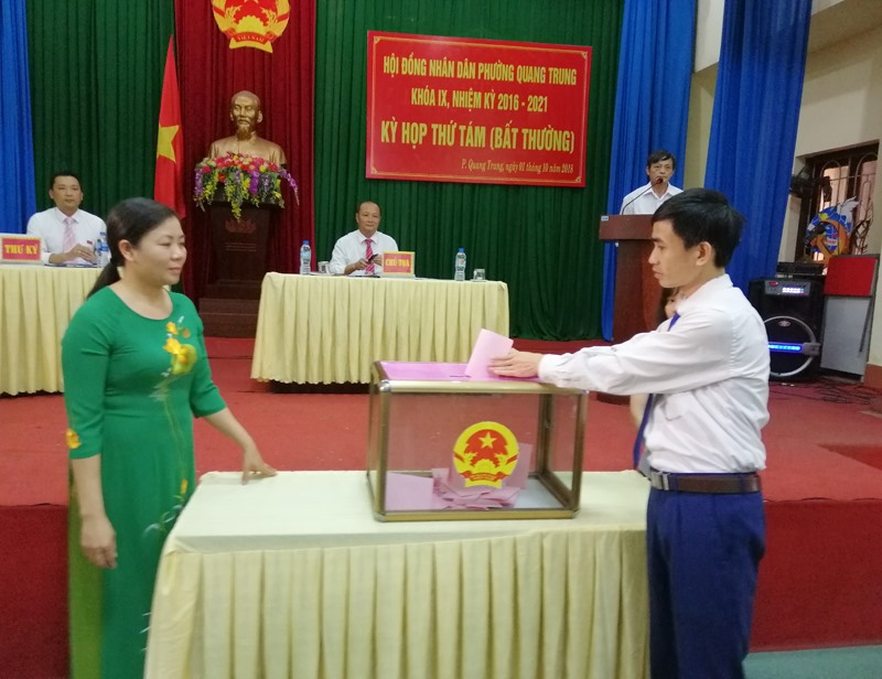 Đại biểu HĐND phường bỏ phiếu bầu bổ sung chức danh Chủ tịch HĐND phường Quang Trung khóa IX, nhiệm kỳ 2016-2021.
