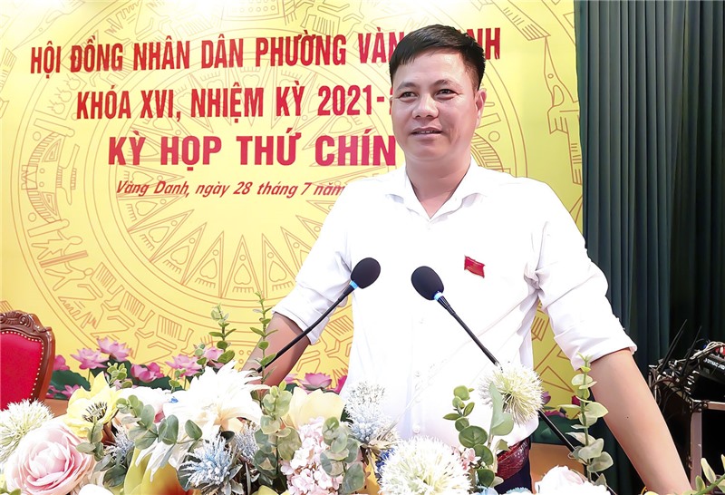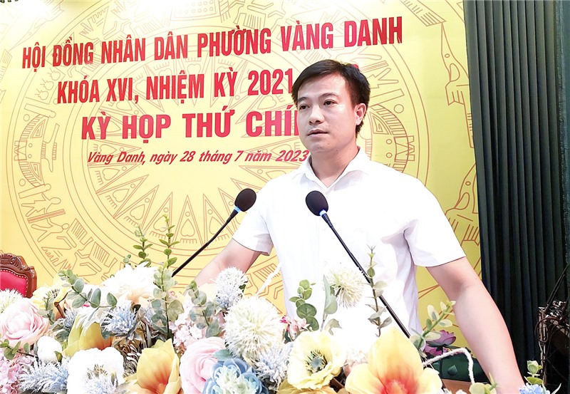 Đồng chí Vũ Văn Dũng, PCT UBND phường Vàng Danh báo cáo tại kỳ họp.