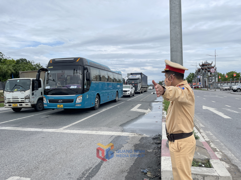 Lực lượng cảnh sát giao thông bố trí chặn tại các ngã tư, điểm cắt từ ngã ba Đốc Đỏ vào Yên Tử để đảm bảo giao thông được thông suốt.