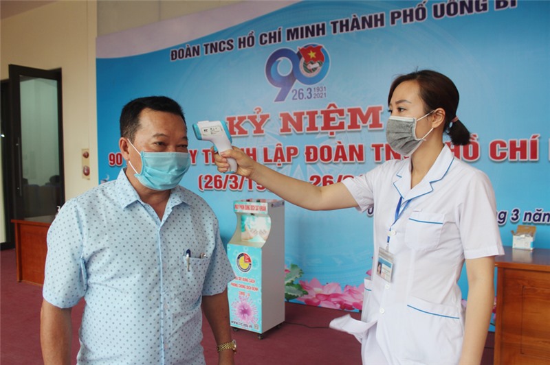 Các đại biểu được kiểm tra thân nhiệt, sát khuẩn tay trước khi tham dự hội nghị.