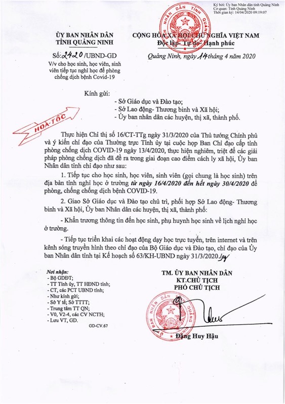 Ngày 14/4, Ủy ban nhân dân tỉnh Quảng Ninh ban hành Công văn số 2420/UBND-GD chỉ đạo về việc cho học sinh, học viên, sinh viên tiếp tục nghỉ học để phòng chống dịch Covid-19.