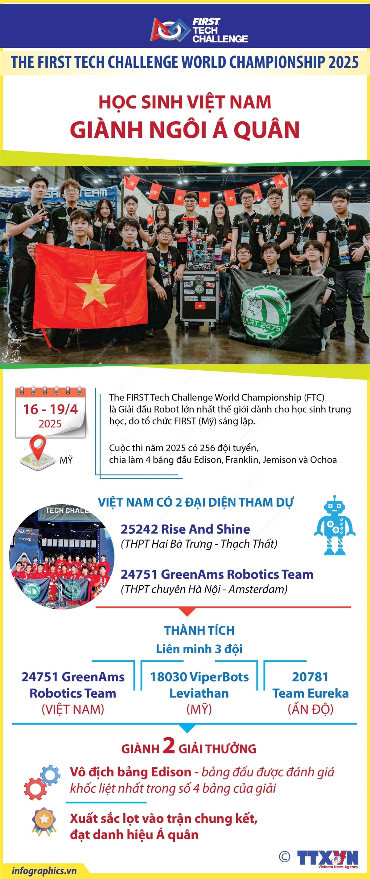 Tại vòng chung kết cuộc thi The FIRST Tech Challenge World Championship 2025, diễn ra từ ngày 16 - 19/4/2025 tại Mỹ, liên minh 3 đội gồm: Đội tuyển 24751 GreenAms Robotics Team đến từ trường THPT chuyên Hà Nội - Amsterdam, 18030 ViperBots Leviathan đến từ Mỹ và 20781 Team Eureka đến từ Ấn Độ đã xuất sắc giành ngôi Á quân thế giới và Vô địch bảng Edison - bảng đấu được đánh giá khốc liệt nhất trong số 4 bảng của giải.