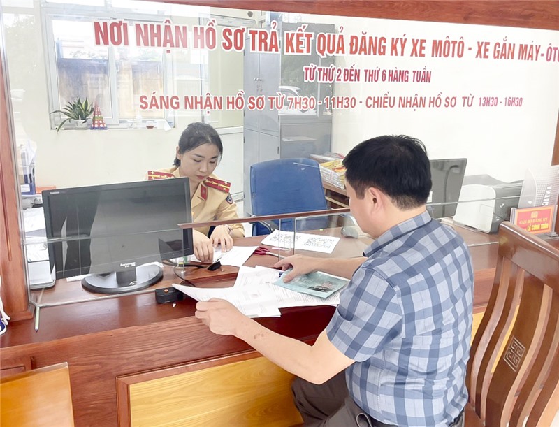 Cán bộ Đội Cảnh sát Giao thông trật tự - Công an thành phố hướng dẫn người dân làm thủ tục đăng ký xe mô tô - xe gắn máy - ô tô