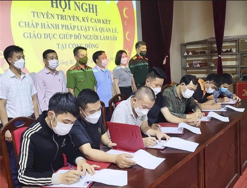 Cán bộ chiến sĩ Công an thành phố tuyên truyền và chứng kiến ký cam kết tại hội nghị tuyên truyền, ký cam kết chấp hành pháp luật, giúp đỡ người lầm lỗi tại cộng đồng.