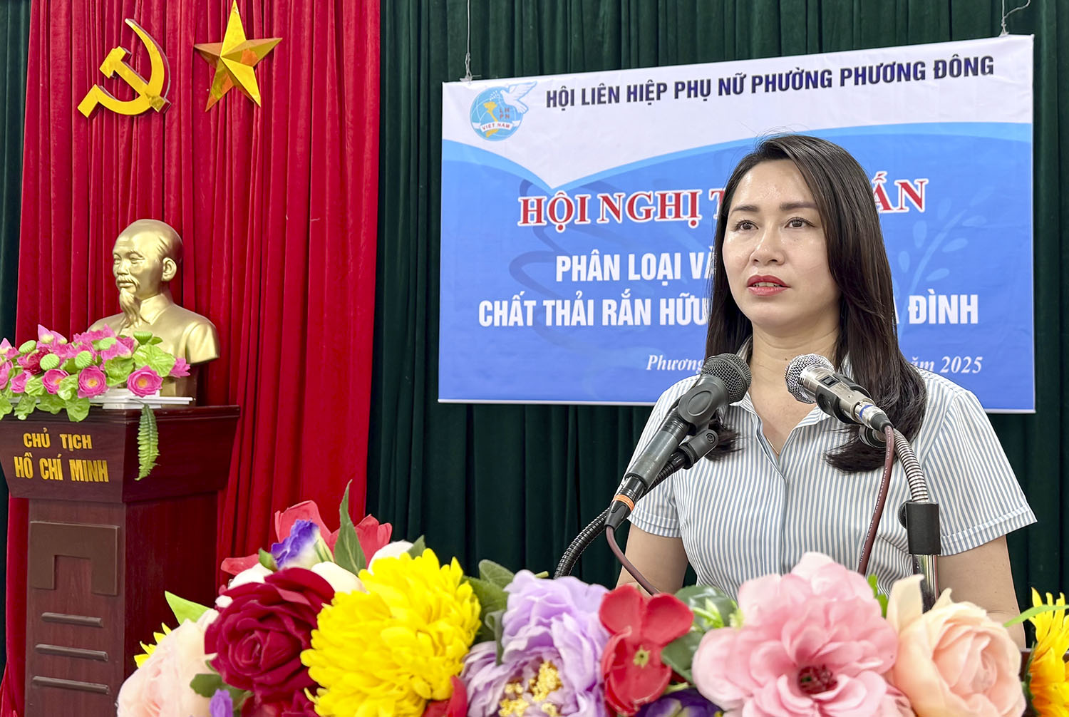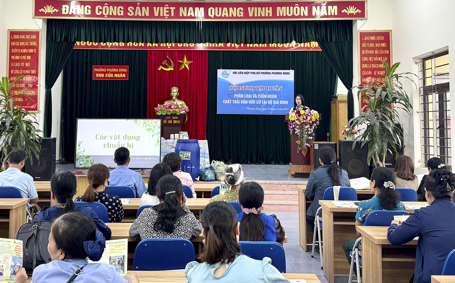 Nhằm nâng cao nhận thức và kỹ năng thực hành bảo vệ môi trường cho hội viên phụ nữ và nhân dân trên địa bàn, sáng 10/4, tại Nhà văn hóa khu Cửa Ngăn, Hội LHPN phường Phương Đông đã tổ chức hội nghị tập huấn với chủ đề “Phân loại và tuần hoàn chất thải rắn hữu cơ tại hộ gia đình”. Dự chương trình có đại diện Hội LHPN tỉnh; lãnh đạo Đảng ủy, Ủy ban MTTQ phường cùng đông đảo hội viên phụ nữ và người dân trên địa bàn.