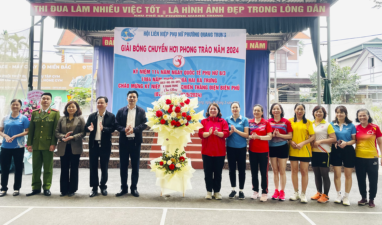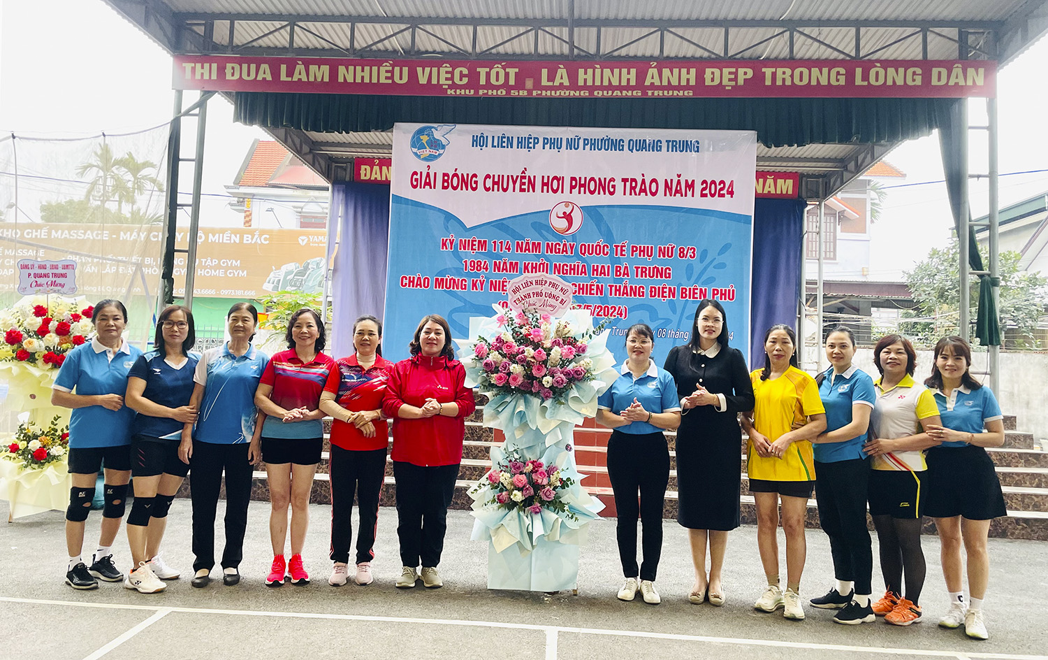 Sáng 8/3, Hội LHPN phường Quang Trung tổ chức Khai mạc Giải Bóng chuyền hơi phong trào năm 2024 kỷ niệm 114 năm Ngày Quốc tế phụ nữ 8/3, 1984 năm cuộc khởi nghĩa hai Bà Trưng, 70 năm chiến thắng Điện Biên Phủ 07/5 (1954-2024). Dự, cổ vũ có đồng chí Vũ Thị Minh Thùy, Phó Chủ tịch Hội LHPN thành phố; lãnh đạo Đảng ủy - HĐND - UBND - MTTQ và các đoàn thể phường; đại diện khu dân cư.