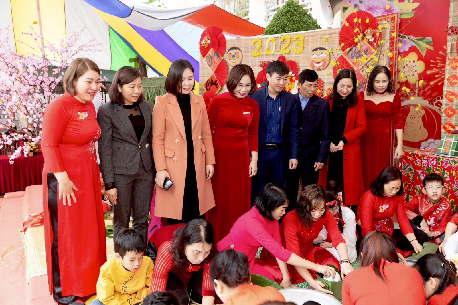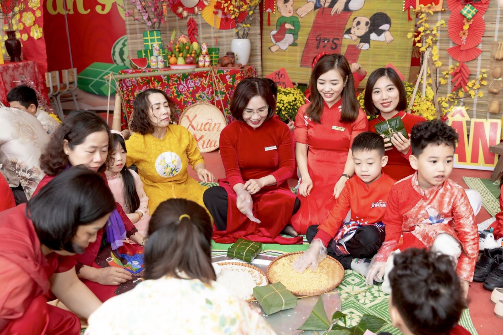 Hoạt động gói bánh chưng thu hút các rất đông các thầy cô giáo, phụ huynh cùng các em học sinh tham gia.