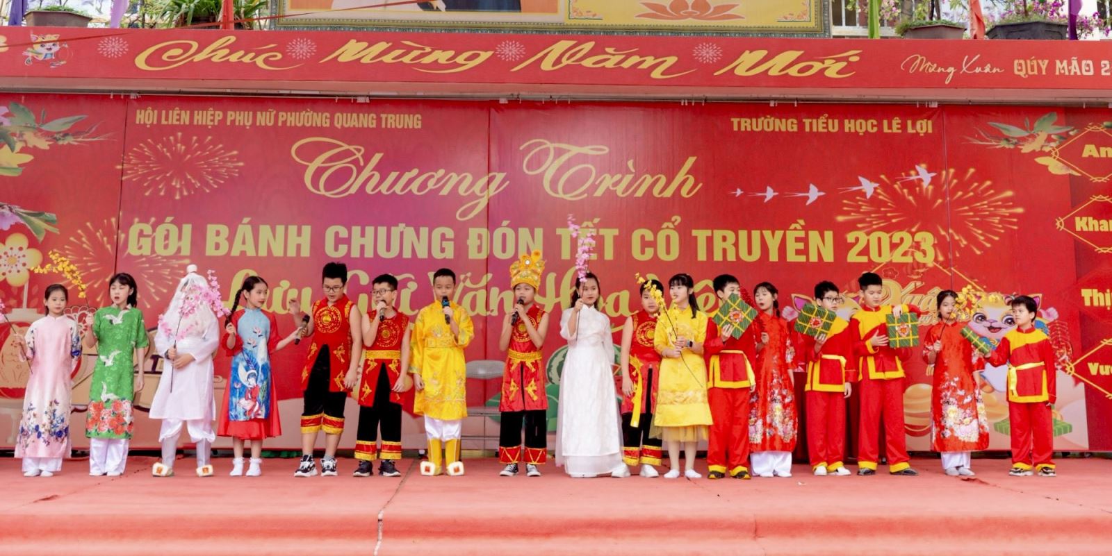 Trong chương trình, các em học sinh và thầy cô giáo Trường Tiểu học Lê Lợi đã cùng tham gia các hoạt động hết sức ý nghĩa như: biểu diễn các tiết mục văn nghệ đặc sắc, vẽ tranh, trả lời các câu đố vui về chủ đề ngày Tết, thi gói bánh chưng giữa các khối lớp…