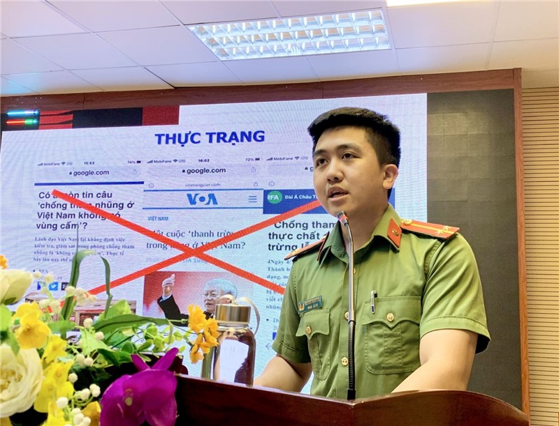 Cán bộ đội nghiệp vụ Công an thành phố thông tin tới hội nghị những nội dung về phòng chống thông tin xấu độc và phòng chống tội phạm trên không gian mạng.