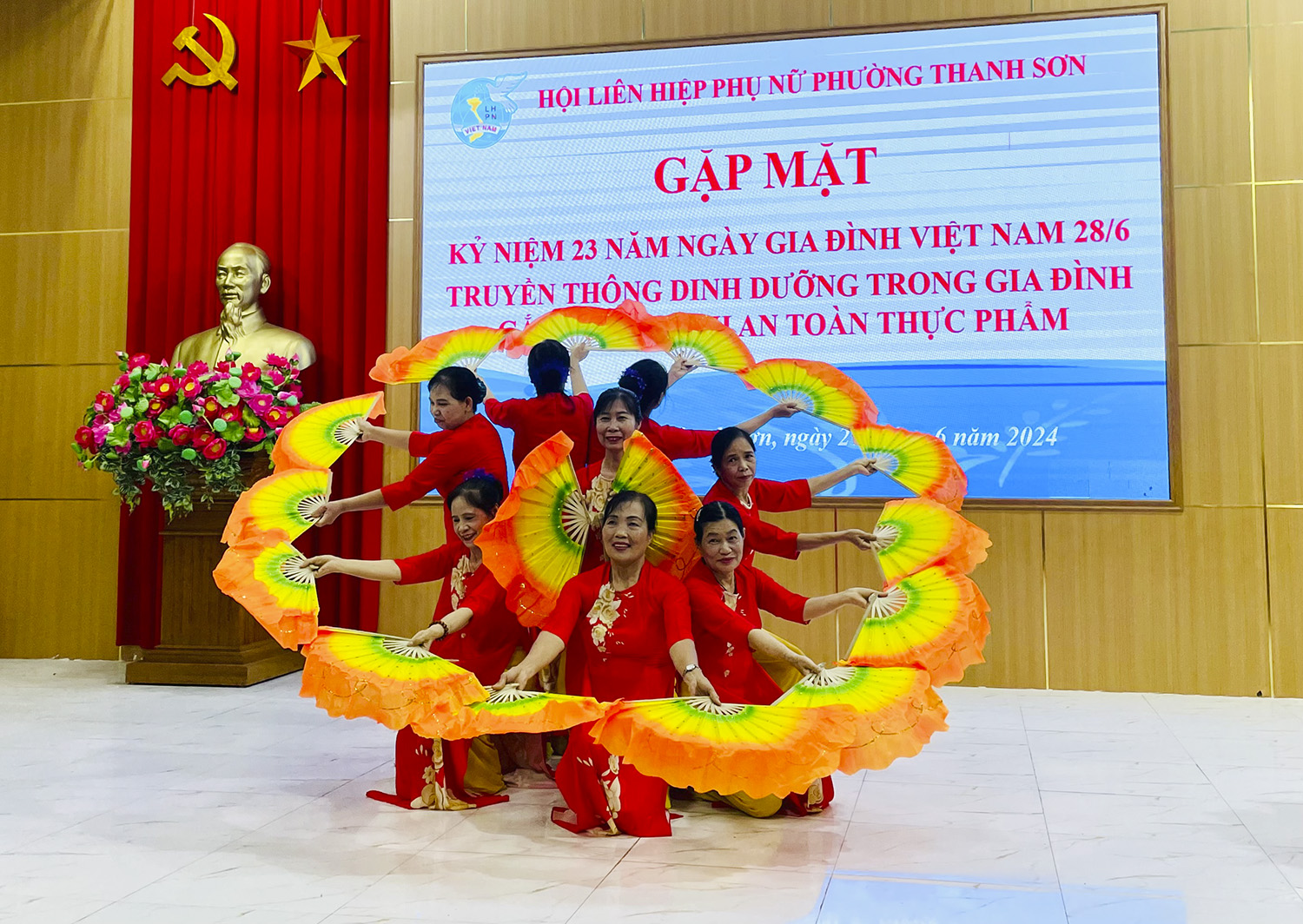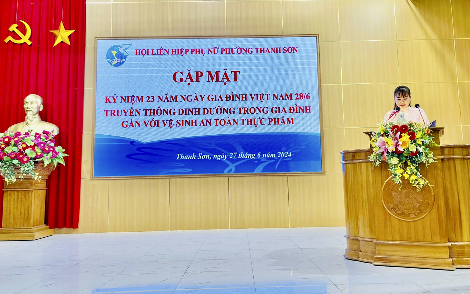 Tối 27/6, Hội LHPN phường Thanh Sơn tổ chức Gặp mặt kỷ niệm 23 năm Ngày Gia đình Việt Nam, truyền thông “Dinh dưỡng trong gia đình gắn với vệ sinh an toàn thực phẩm”. Dự chương trình có đồng chí Vũ Thị Minh Thùy, Phó Chủ tịch Hội LHPN thành phố; lãnh đạo Đảng ủy - HĐND - UBND phường.
