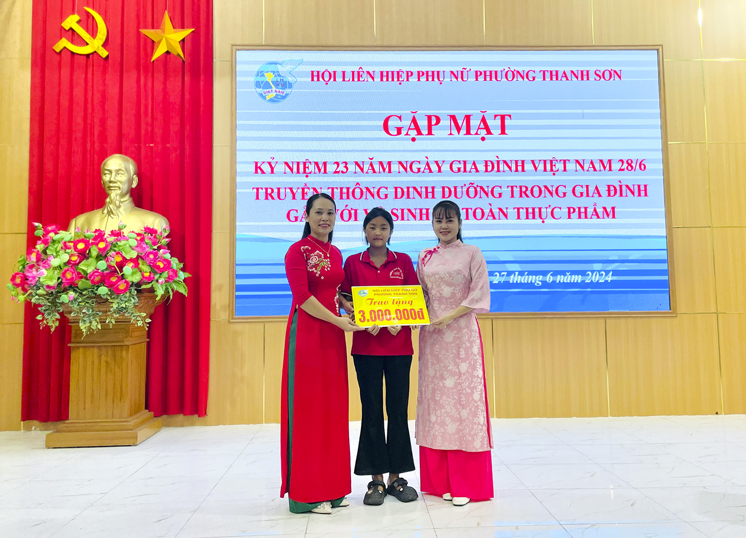 Cũng tại chương trình gặp mặt, Hội LHPN phường Thanh Sơn đã trao kinh phí hỗ trợ 3 triệu đồng/năm theo chương trình “Mẹ đỡ đầu” cho cháu Đỗ Phương My, trú tại khu 8. Cháu My mồ côi cha mẹ, ở với bà ngoại. Việc trao kinh phí hỗ trợ sẽ giúp em vơi bớt khó khăn, có thêm động lực để học tập, vươn lên trong cuộc sống.