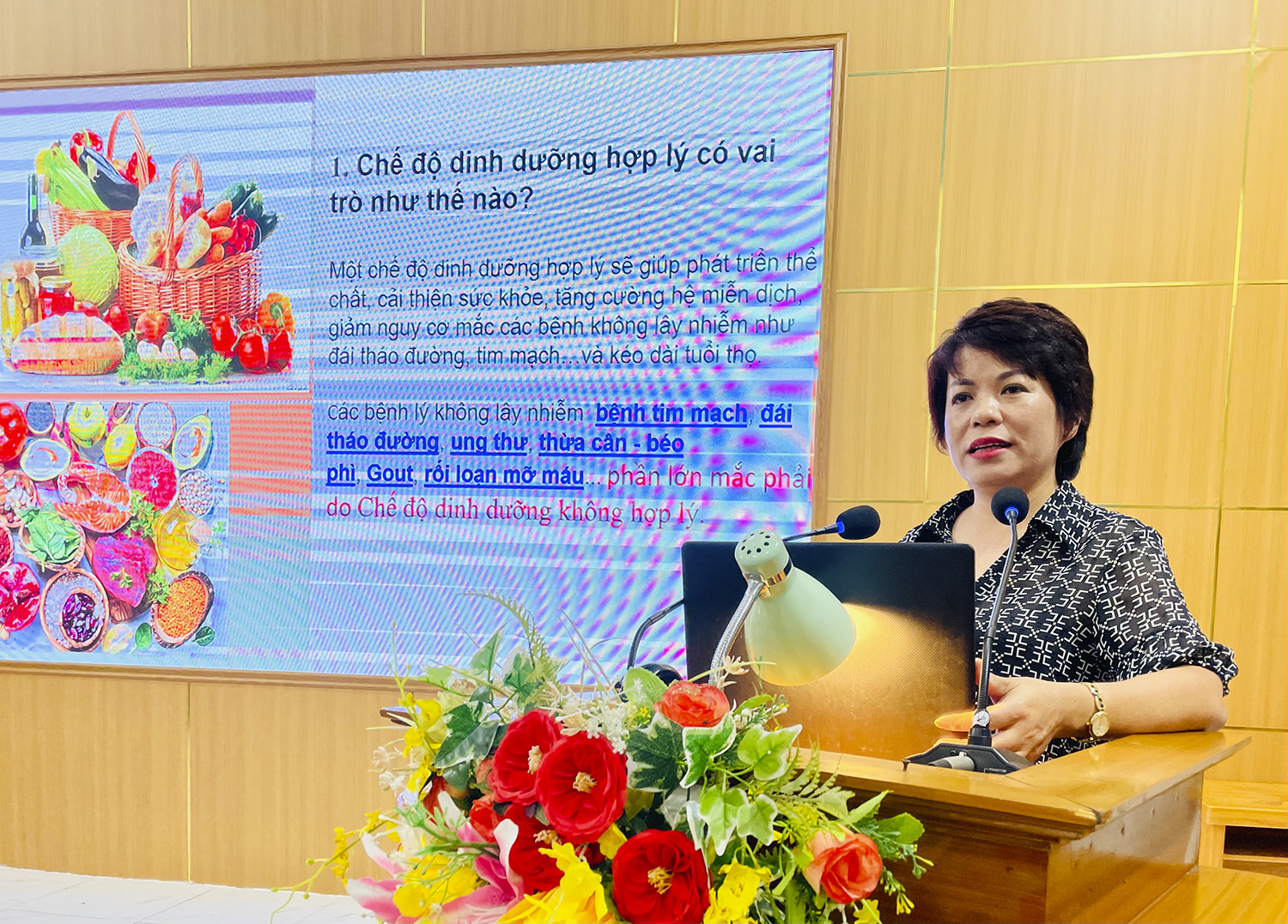 Nhằm chia sẻ cho hội viên, phụ nữ những kiến thức cơ bản trong việc lựa chọn thực phẩm sạch, nguồn gốc rõ ràng, cách thức chế biến thực phẩm đảm bảo vệ sinh an toàn thực phẩm và dinh dưỡng, phục vụ bữa ăn trong gia đình, chương trình đã dành thời gian trao đổi về chủ đề “Dinh dưỡng trong gia đình gắn với vệ sinh an toàn thực phẩm”. Theo đó, lãnh đạo Phòng Y tế thành phố đã chia sẻ những thông tin hữu ích về vai trò, cách xây dựng chế độ dinh dưỡng hợp lý, đầy đủ và khoa học; dấu hiệu của việc mất cân bằng về dinh dưỡng cũng như các bệnh lý thường gặp; đồng thời, đưa ra những lời khuyên dinh dưỡng hợp lý cho bữa ăn gia đình.