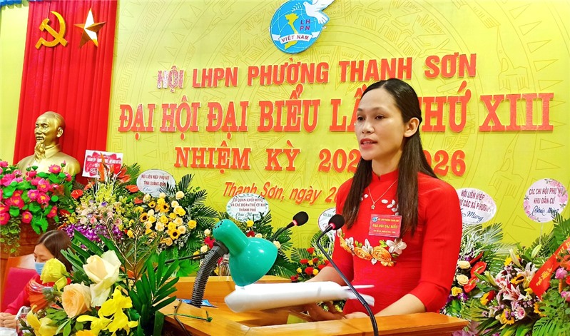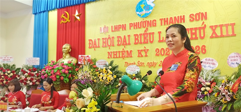 Đồng chí Chủ tịch Hội LHPN phường Thanh Sơn báo cáo tại Đại hội.