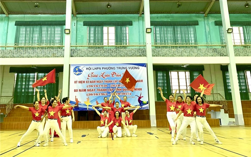 Ngày 14/10, Hội LHPN phường Trưng Vương tưng bừng tổ chức Chương trình giao lưu dân vũ kỷ niệm 93 năm Ngày thành lập Hội LHPN Việt Nam (20/10/1930 - 20/10/2023); 60 năm ngày thành lập tỉnh Quảng Ninh (30/10/1963 - 30/10/2023). Dự chúc mừng chương trình có đồng chí Lê Thị Như Quỳnh, Chủ tịch Hội LHPN thành phố; lãnh đạo phường Trưng Vương.