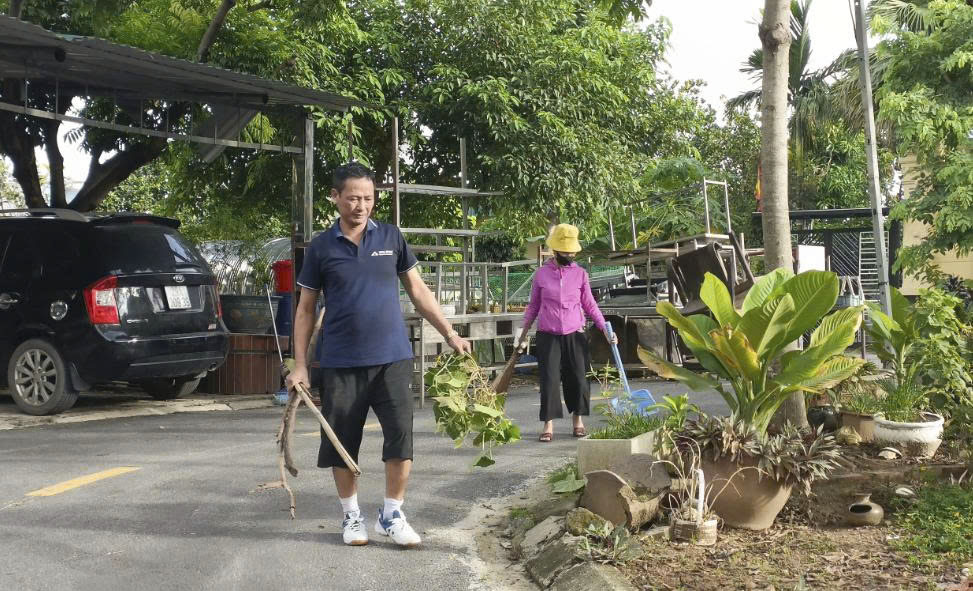 Đồng chí Phạm Văn Sự, Chủ tịch Hội Nông dân phường Uông Bí tham gia dọn vệ sinh cùng nhân dân khu Đền Công 1.