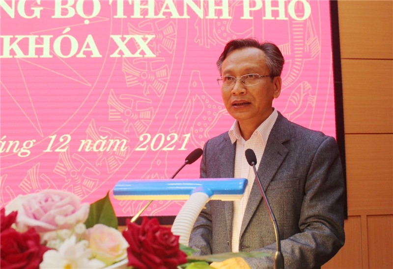 Đồng chí Nguyễn Chiến Thắng, Phó Bí thư Thường trực Thành ủy báo cáo kết quả lãnh đạo thực hiện nhiệm vụ năm 2021.