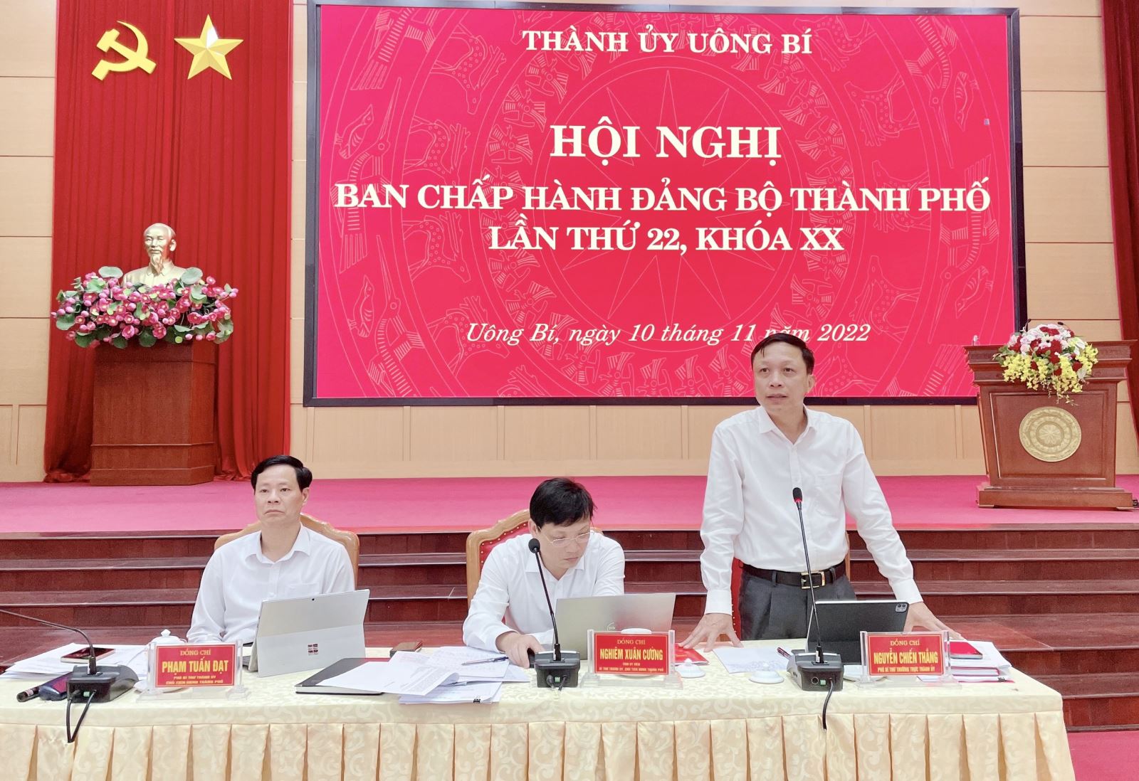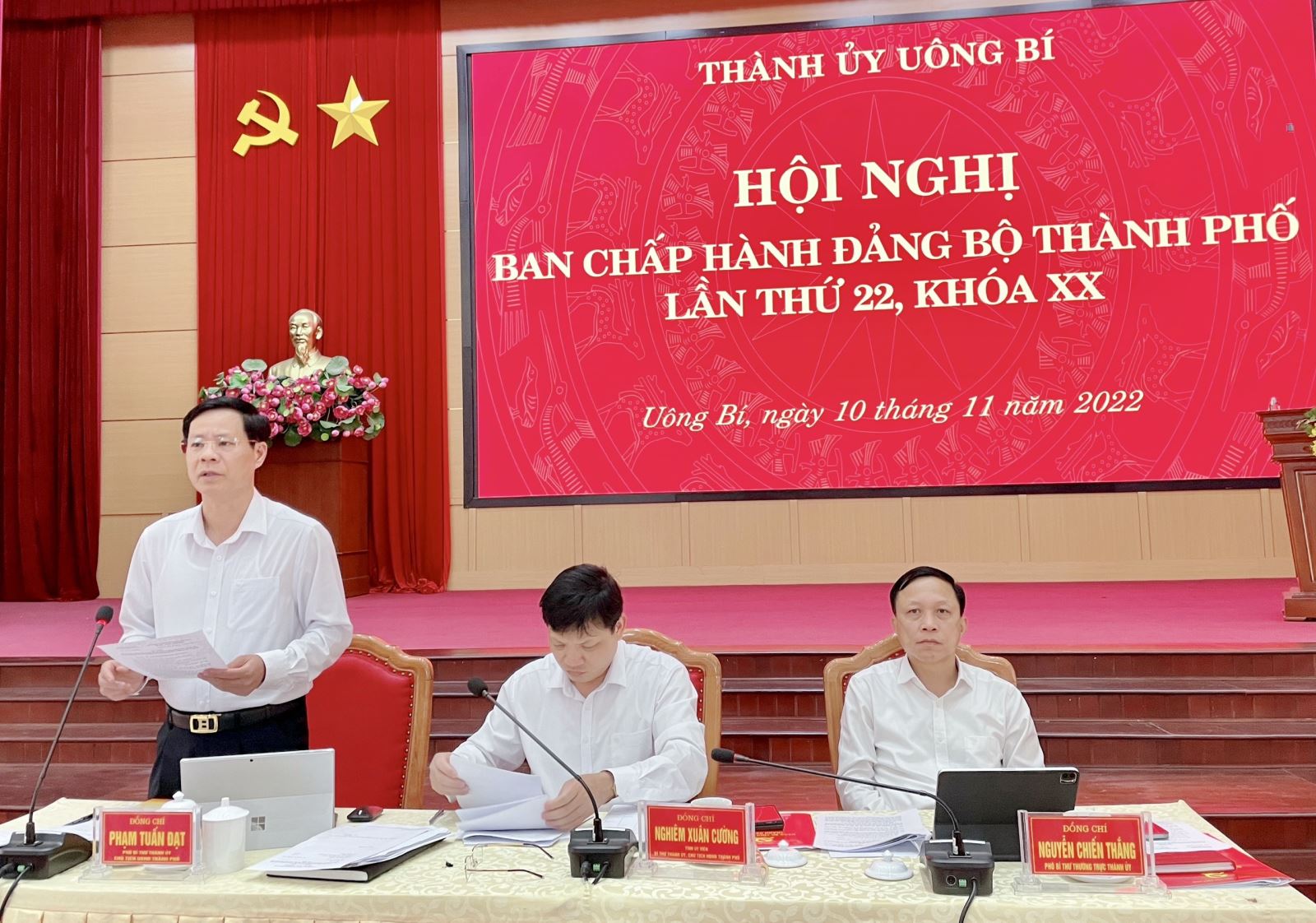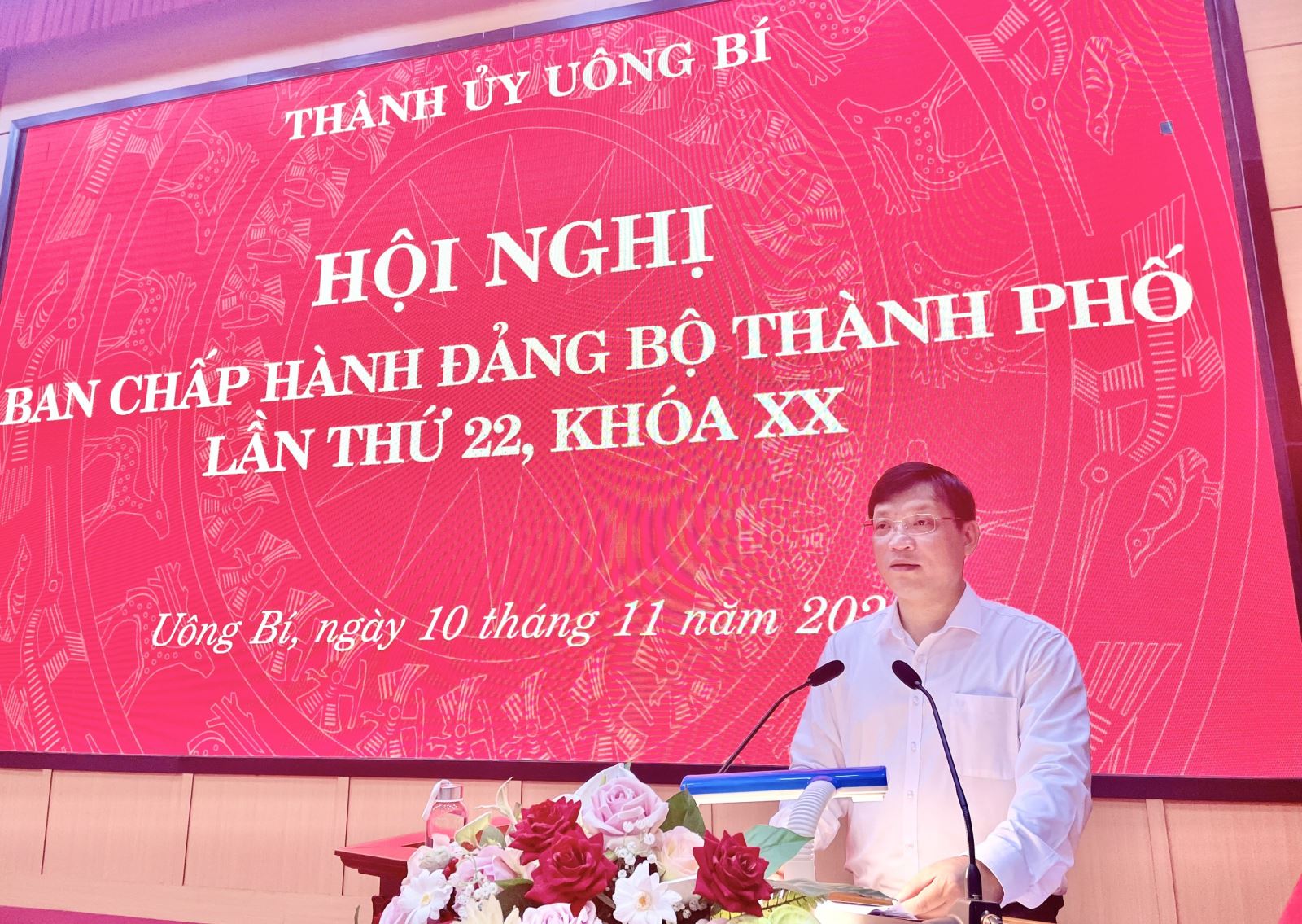 Ngày 10/11, Ban chấp hành Đảng bộ TP Uông Bí tổ chức Hội nghị lần thứ 22 mở rộng nhằm cho ý kiến vào các nội dung quan trọng, gồm: Điều chỉnh quy hoạch chung xây dựng thành phố đến năm 2030, tầm nhìn đến năm 2050 và Quy hoạch phân khu A; điều chỉnh chủ trương đầu tư dự án Tuyến đường Yên Tử kéo dài đoạn từ Quốc lộ 18A đến Quốc lộ 10 và đường 10 làn xe thành phố Uông Bí; Điều chỉnh dự toán chi ngân sách địa phương năm 2022; Điều chỉnh, bổ sung kế hoạch đầu tư công trung hạn giai đoạn 2021-2025; Điều chỉnh kế hoạch vốn đầu tư xây dựng cơ bản và chỉnh trang đô thị năm 2022; Chủ trương tổ chức lại các cơ quan tham mưu giúp việc của Thành ủy, các phòng chuyên môn trực thuộc UBND thành phố và các nội dung khác. Các đồng chí: Nghiêm Xuân Cường, Tỉnh ủy viên, Bí thư Thành ủy, Chủ tịch HĐND thành phố; Nguyễn Chiến Thắng, Phó Bí thư Thường trực Thành ủy; Phạm Tuấn Đạt, Phó Bí thư Thành ủy, Chủ tịch UBND thành phố đồng chủ trì hội nghị.