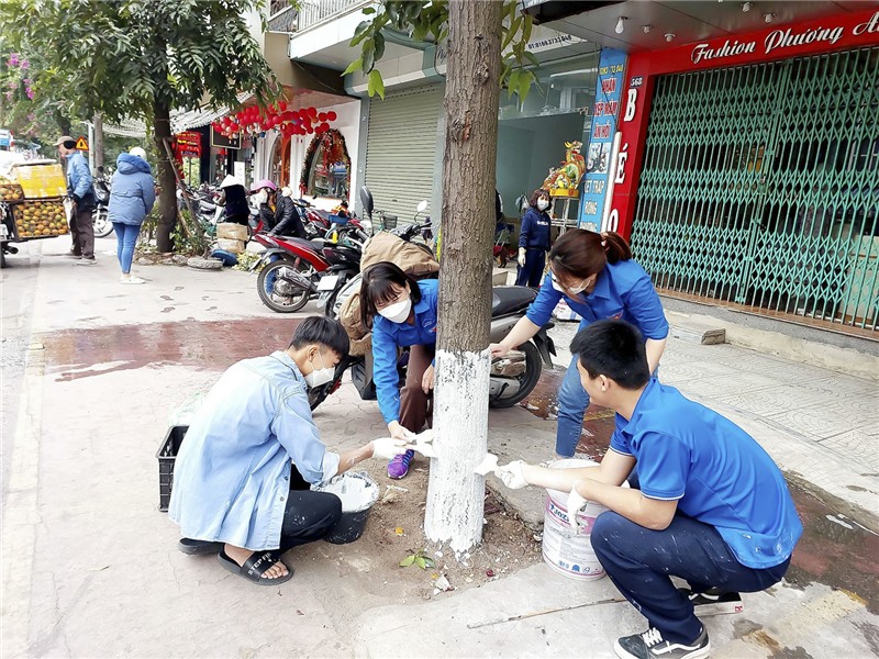 Đoàn Thanh niên phường Quang Trung ra quân quét vôi gốc cây trên các tuyến phố chính trên địa bàn thành phố.