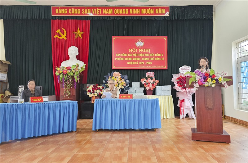 Tại hội nghị, Ban Công tác Mặt trận khu Đền Công 2 đã hiệp thương cử Ban Công tác Mặt trận nhiệm kỳ mới với 8 thành viên; cử đoàn đại biểu đi dự Đại hội MTTQ phường Trưng Vương, nhiệm kỳ 2024-2029. Hội nghị cũng biểu dương, khen thưởng 1 tập thể và 10 cá nhân có thành tích xuất sắc trong công tác Mặt trận nhiệm kỳ vừa qua.