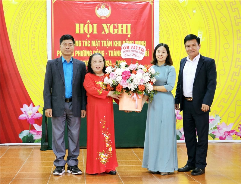Lãnh đạo cấp trên tặng hoa chúc mừng Ban công tác mặt trận khu Đồng Minh.