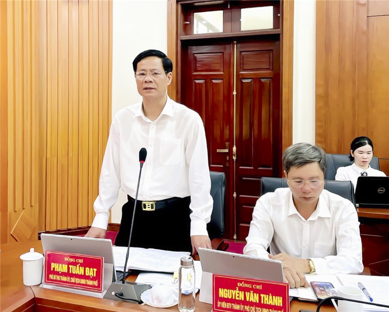 Đồng chí Phạm Tuấn Đạt, Phó Bí thư Thành uỷ, Chủ tịch UBND thành phố phát biểu tại hội nghị.