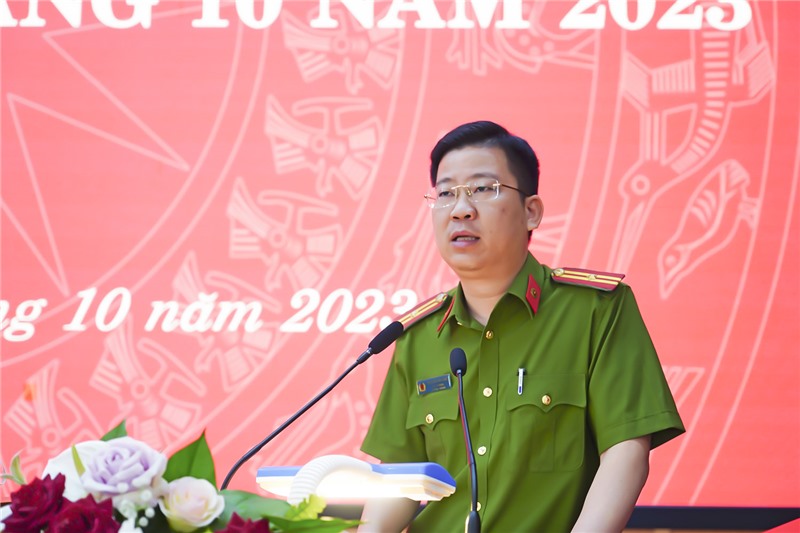 Đại diện Công an Thành phố Uông Bí thông tin tình hình, kết quả triển khai thực hiện Đề án 06 của Thủ tướng Chính phủ gắn với Chỉ thị số 34-CT/TU, ngày 23/6/2023 của Ban Thường vụ Tỉnh ủy.