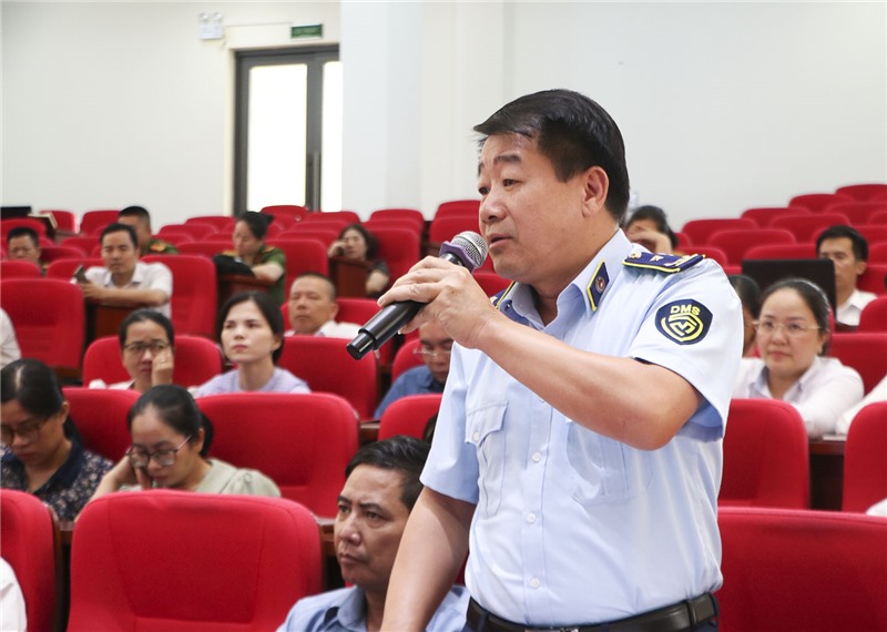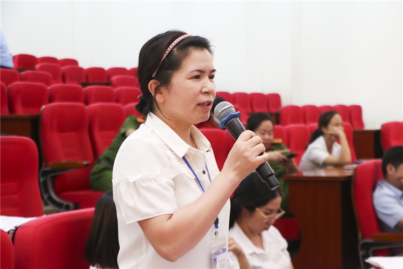 Các đại biểu trao đổi với cán bộ Sở Tư pháp về thi hành pháp luật về xử lý vi phạm hành chính.
