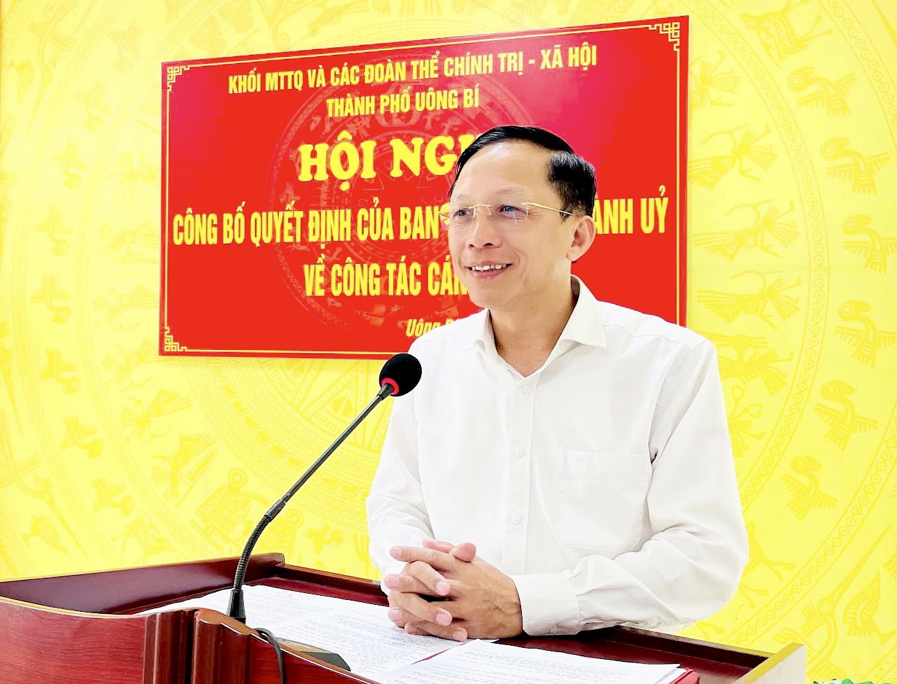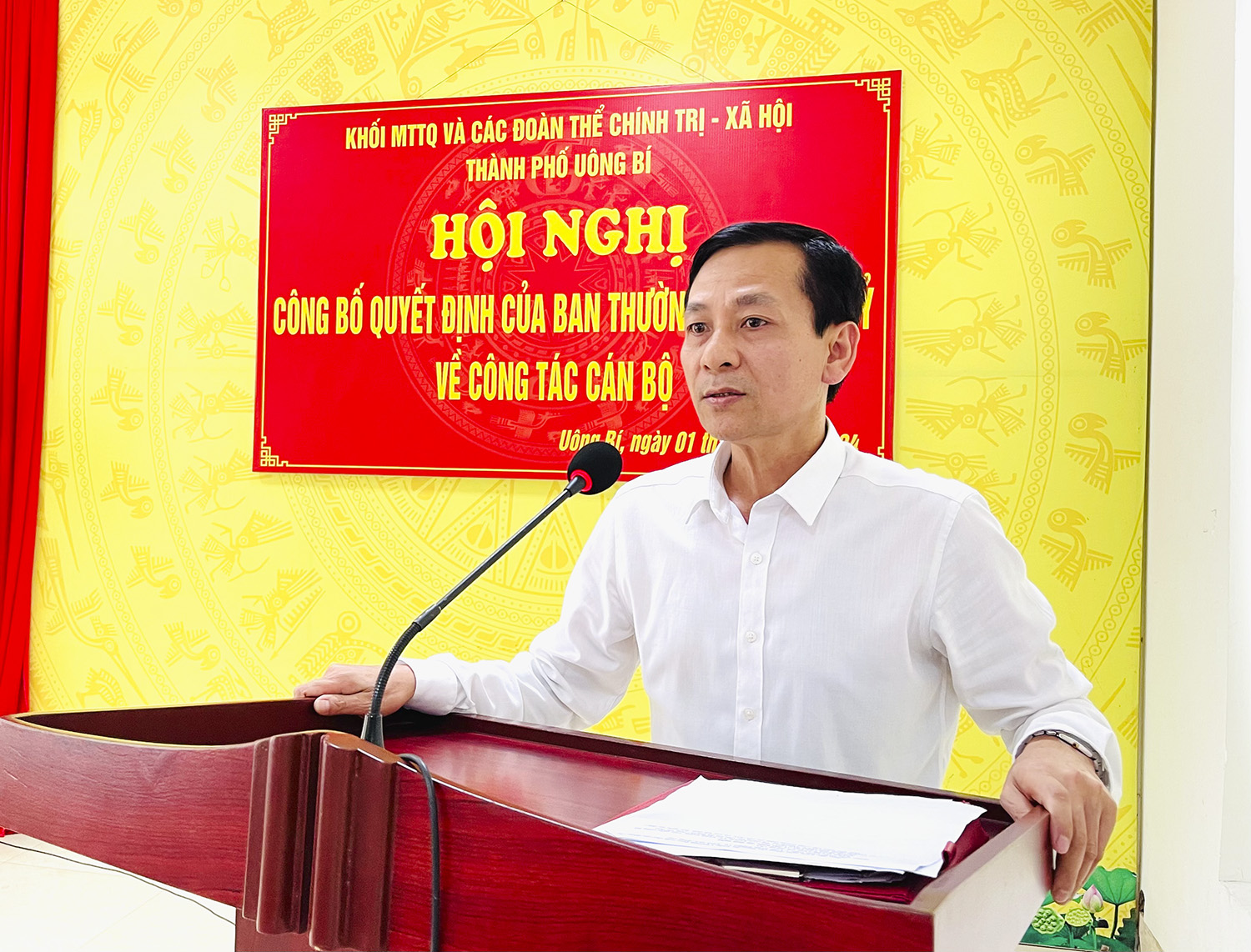Tại hội nghị, lãnh đạo Ban tổ chức Thành ủy đã công bố các Quyết định của BTV Thành ủy về việc tiếp nhận đồng chí Nguyễn Xuân Chương, Phó Trưởng phòng Nội vụ thành phố Uông Bí đến nhận công tác tại Ủy ban MTTQ thành phố, giữ chức Phó Chủ tịch Ủy ban MTTQ thành phố nhiệm kỳ 2024 - 2029; công bố Quyết định về việc tiếp nhận và phân công công tác đối với đồng chí Phạm Thị Hồng Liên và đồng chí Đỗ Đức Mạnh vào làm việc tại Cơ quan Thành Đoàn Uông Bí.