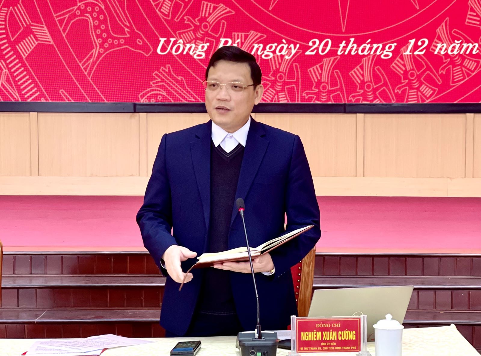 Đồng chí Nghiêm Xuân Cường, Tỉnh ủy viên, Bí thư Thành ủy, Chủ tịch HĐND thành phố phát biểu tại hội nghị.