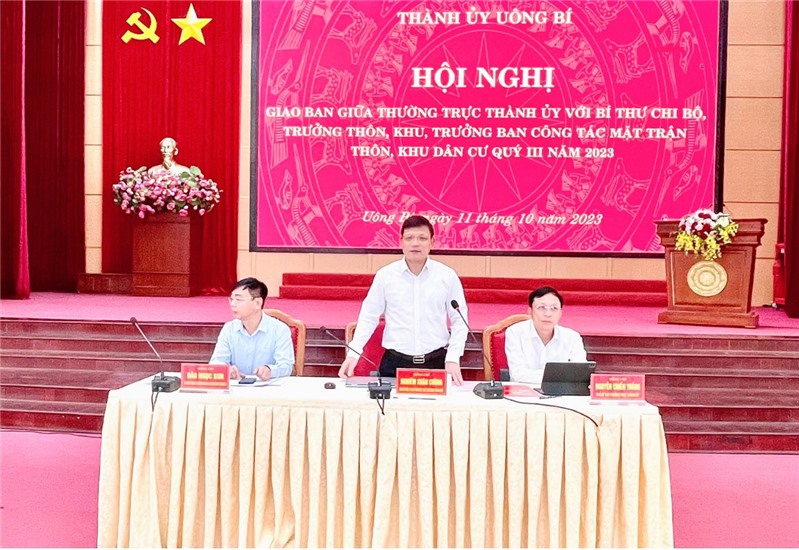 Ngày 11/10, Thường trực Thành ủy tổ chức Hội nghị giao ban giữa thường trực Thành ủy với Bí thư chi bộ, Trưởng thôn, khu, Trưởng ban công tác mặt trận thôn khu dân cư Quý III năm 2023. Đồng chí Nghiêm Xuân Cường, Tỉnh ủy viên, Bí thư Thành ủy, Chủ tịch HĐND thành phố; đồng chí Nguyễn Chiến Thắng, Phó Bí thư Thường trực Thành ủy; đồng chí Đào Ngọc Sơn, Uỷ viên BTV, Trưởng ban Dân vận Thành ủy, Chủ tịch Ủy ban MTTQ thành phố đồng chủ trì hội nghị. Dự hội nghị có lãnh đạo các Ban xây dựng Đảng Thành ủy; lãnh đạo UBND thành phố, lãnh đạo các phòng chức năng, các đơn vị xã phường trên địa bàn; các đồng chí là Bí thư chi bộ, Trưởng thôn, khu, Trưởng ban công tác mặt trận thôn khu dân cư trên địa bàn.