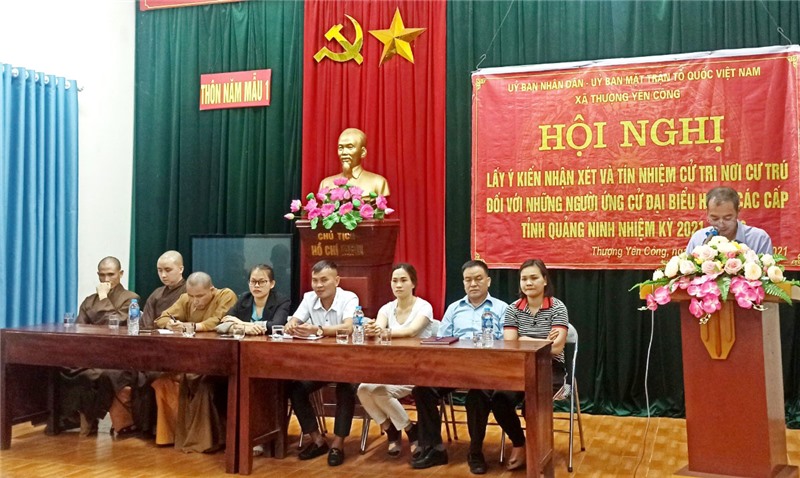 Tại hội nghị, các đại biểu cử tri đã được nghe giới thiệu danh sách 9 người ứng cử đại biểu HĐND các cấp nhiệm kỳ 2021-2026 đang thường trú trên địa bàn thôn Năm Mẫu 1, thông qua tiểu sử tóm tắt của từng người ứng cử. Theo đó, Đại đức Thích Trúc Tử Thuận, Tu sỹ Chùa Lân - Thiền viện Trúc Lâm Yên Tử là người ứng cử ở cả 2 cấp là Đại biểu HĐND tỉnh Quảng Ninh và Đại biểu HĐND thành phố Uông Bí. Ngoài ra, người ứng cử Đại biểu HĐND thành phố Uông Bí còn có: Đại đức Thích Trúc Tử Kiến, Phó Trưởng ban Trị sự Phật giáo thành phố Uông Bí; bà Lý Thị Nhung, Chủ tịch Hội LHPN xã Thượng Yên Công. Người ứng cử Đại biểu HĐND xã Thượng Yên Công gồm: bà Lý Thị Nhung, Chủ tịch Hội LHPN xã; bà Nguyễn Thụy Điển, Chi hội trưởng chi hội Nông dân thôn Năm Mẫu 1; ông Bàn Duy Định, Phó Chỉ huy trưởng Quân sự xã Thượng Yên Công; ông Triệu Xuân Mai, Phó Trưởng thôn Năm Mẫu 1; bà Nguyễn Thị Nguyệt, UV BCH Hội LHPN thôn Năm Mẫu 1; ông Bàn Xuân Viên, PCT Hội Nông dân xã Thượng Yên Công; Đại đức Thích Trúc Tử Thường, Trưởng ban Xây dựng Từ thiện Thiền viện Chùa Lân.