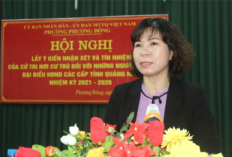 Tại đây, đại biểu cử tri đã được nghe giới thiệu danh sách và tiểu sử tóm tắt của 8 người ứng cử đại biểu HĐND các cấp nhiệm kỳ 2021-2026 hiện đang cư trú tại khu Bí Trung1, phường Phương Đông. Bao gồm: ông Nguyễn Đức Thành, Ủy viên BTV Tỉnh ủy, Chủ nhiệm Ủy ban kiểm tra Tỉnh ủy Quảng Ninh; ông Trần Thanh Tuấn, công chức Văn phòng - Thống kê UBND phường Vàng Danh ứng cử đại biểu HĐND TP Uông Bí và đại biểu HĐND phường Vàng Danh; 4 ông bà ứng cử đại biểu HĐND phường Phương Đông là bà Nguyễn Thị Tuyết Mai - Công chức Văn hóa - Xã hội phường Phương Đông, ông Vũ Văn Chiến - Phó Chỉ huy trưởng Ban chỉ huy quân sự phường Phương Đông, ông Nguyễn Việt Hồng - Bí thư chi bộ, Trưởng khu Bí Trung 1, bà Vũ Thị Bích Ngọc – Bí thư chi đoàn thanh niên khu Bí Trung 1; ông Nguyễn Văn Xuân – Công chức Tư pháp – Hộ tịch UBND xã Thượng Yên Công ứng cử đại biểu HĐND xã Thượng Yên Công; bà Vũ Thị Ánh - Giáo viên Trường Tiểu học Phương Nam A ứng cử đại biểu HĐND phường Phương Nam.