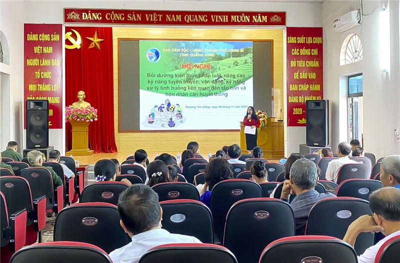 Thực hiện Kế hoạch số 46/KH-BDT ngày 17/3/2023 của Ban Dân tộc về thực hiện Đề án "Giảm thiểu tình trạng tảo hôn và hôn nhân cận huyết thống trong vùng đồng bào dân tộc thiểu số giai đoạn 2021-2025" (giai đoạn II), ngày 9/11, tại UBND xã Thượng Yên Công, Ban Dân tộc UBND tỉnh tổ chức Hội nghị tập huấn, bồi dưỡng kiến thức pháp luật, nâng cao kỹ năng tuyên truyền, vận động, kỹ năng xử lý các tình huống trong giải quyết các vụ việc liên quan đến tảo hôn và hôn nhân cận huyết thống tại thành phố Uông Bí năm 2023.