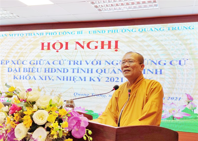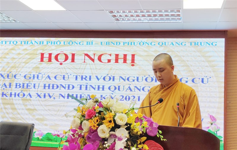 Các ứng cử viên đại biểu HĐND tỉnh khóa XIV, nhiệm kỳ 2021-2026, gồm các ông, bà: ông Bùi Quang Bình - PGĐ Công an tỉnh, ông Hoàng Nghĩa Hộ (Thượng tọa Thích Đạo Hiển) Uỷ viên thường trực Trung ương giáo hội phật giáo Việt Nam, Phó trưởng Ban giáo dục Phật giáo Trung ương; ông Vũ Hoàng Hải (Đại đức Thích Trúc Tử Thuận) tu sỹ phật giáo; bà Bùi Thị Phương Mai - Trưởng phòng Xây dựng phong trào toàn dân bảo vệ ANTQ - CA tỉnh Quảng Ninh; ông Phạm Thành Trung - Trưởng phòng công tác HĐND thuộc Văn phòng đoàn đại biểu QH và HĐND tỉnh.