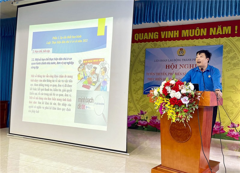 Trong chương trình, báo cáo viên của Ban chính sách pháp luật và Quan hệ lao động LĐLĐ tỉnh đã truyền đạt tới các đại biểu chuyên đề: Phổ biến Luật Thực hiện dân chủ ở cơ sở năm 2022 và Thông tư số 11/2020/TT-BGDĐT của Bộ Giáo dục và Đào tạo hướng dẫn thực hiện dân chủ trong hoạt động của cơ sở giáo dục công lập. Hội nghị cũng đã dành thời gian để các đại biểu đối thoại, giải đáp, tư vấn các nội dung liên quan quy chế dân chủ ở cơ sở; hội nghị Cán bộ, công chức, viên chức; hoạt động Ban Thanh tra nhân dân.
