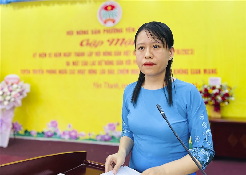 Đồng chí Cao Thị Thu Hằng, Chủ tịch Hội Nông dân phường ôn lại truyền thống 93 năm Ngày thành lập Hội Nông dân Việt Nam.