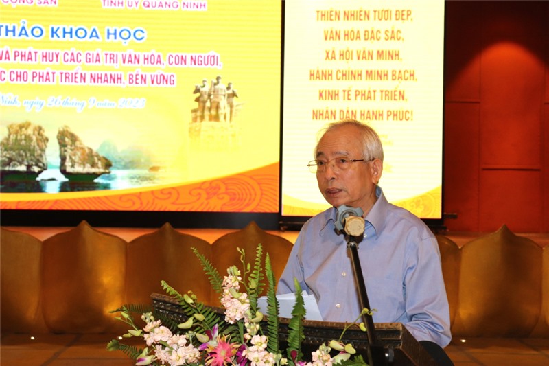 Cùng với tư cách một người hoạt động khoa học, tôi tự coi mình là “người của Quảng Ninh”, gắn bó thực sự với Quảng Ninh gần 60 năm qua. Trong sự trải nghiệm và tình cảm mến yêu đó, tôi tâm đắc và đồng cảm với chủ đề Hội thảo này: “Quảng Ninh khơi dậy và phát huy các giá trị văn hóa, con người, tạo động lực và nguồn lực quan trọng cho phát triển nhanh, bền vững”. Chủ đề đúng và trúng với Quảng Ninh khi trong suốt thời gian qua, tỉnh đã và đang khơi dậy và phát huy các giá trị văn hóa, con người, một nguồn “tài nguyên” đặc biệt của Quảng Ninh, đúng như tiên đoán của đồng chí Tổng Bí thư Lê Duẩn khi đến thăm Quảng Ninh từ những năm 60 của thế kỷ trước: “Than đá có thể hết nhưng nguồn lợi về Hạ Long thì vô tận”. Tài nguyên văn hóa của Quảng Ninh càng khai thác, phát huy và bảo vệ càng phát triển, nguồn lợi càng lớn, không thể cạn kiệt.