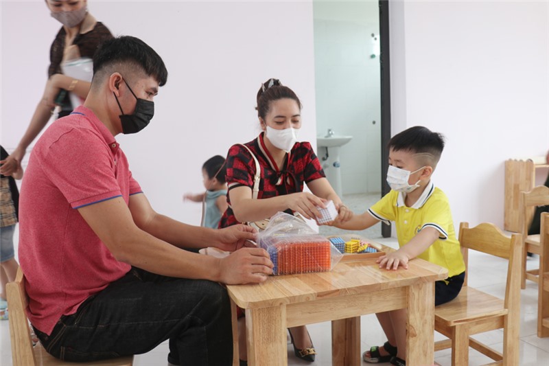 Các bé và phụ huynh thăm quan, trải nghiệm phòng học và bộ học cụ montessori.