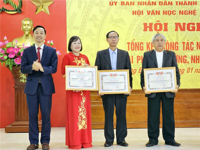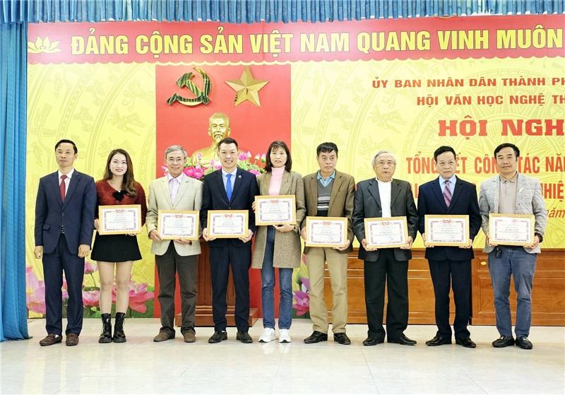 Nhân dịp này, Hội VHNT thành phố đã khen thưởng 3 tập thể, 9 cá nhân có thành tích xuất sắc trong hoạt động VHNT; đồng thời, trao hỗ trợ các tác giả có tác phẩm được công bố, xuất bản năm 2023 và kết nạp 1 hội viên mới.