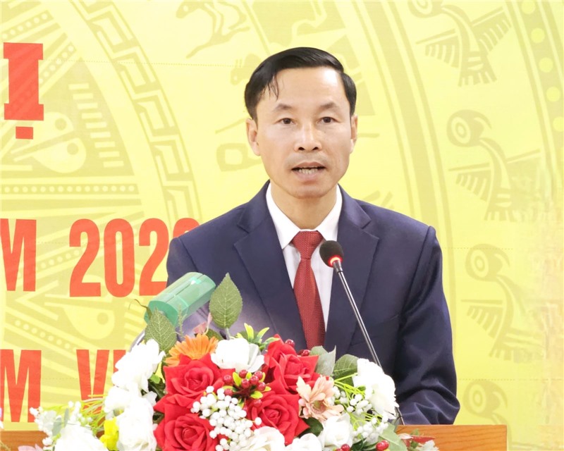 Đồng chí Hoàng Quốc Trung, Uỷ viên BTV Thành ủy, Giám đốc Trung tâm Chính trị, Chủ tịch Hội VHNT thành phố phát biểu tại hội nghị.
