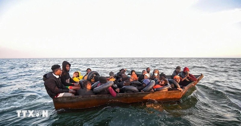 Người di cư lênh đênh trên Địa Trung Hải ở ngoài khơi bờ biển thành phố Sfax, Tunisia. (Ảnh: AFP/TTXVN)