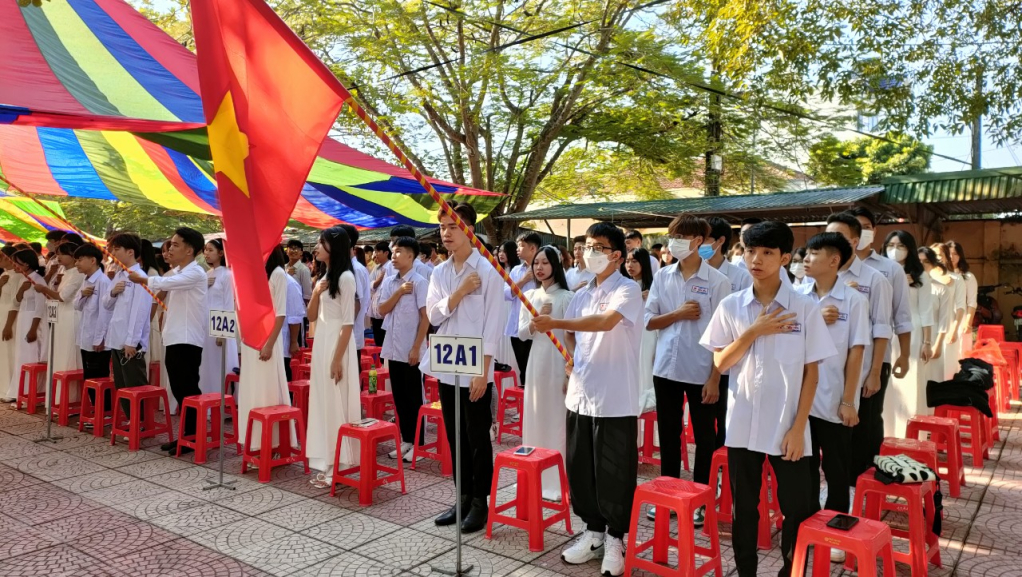 Các em học sinh Trường THPT Tiên Yên nghiêm trang trong lễ chào cờ năm học mới 2022 - 2023. Ảnh: Xuân Thao