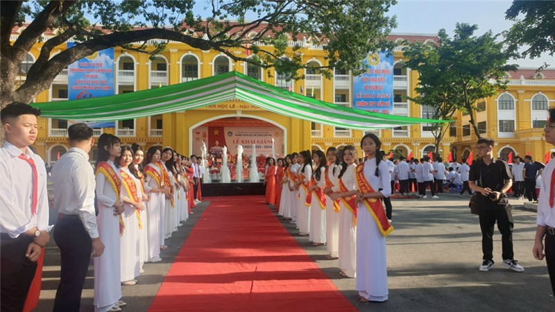 Các em học sinh Trường THPT Cẩm Phả đón năm học mới 2023 - 2024 trong ngôi trường mới chất lượng cao vừa được hoàn thiện. Ảnh: Thu Chung.