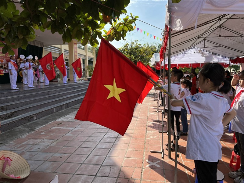 Các em học sinh cử hành nghi lễ chào cờ, chính thức bước vào năm học mới 2023-2024. Ảnh: Hằng Ngần.