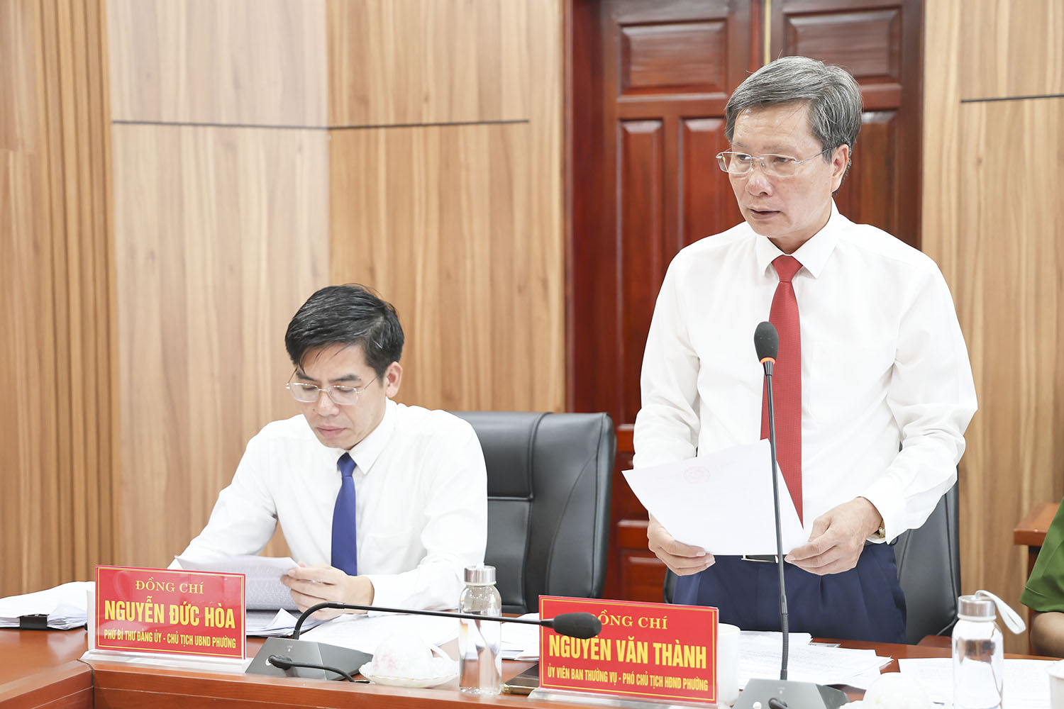 Đồng chí Nguyễn Đức Hoà, Phó Bí thư Đảng uỷ, Chủ tịch UBND phường phát biểu tại cuộc họp.